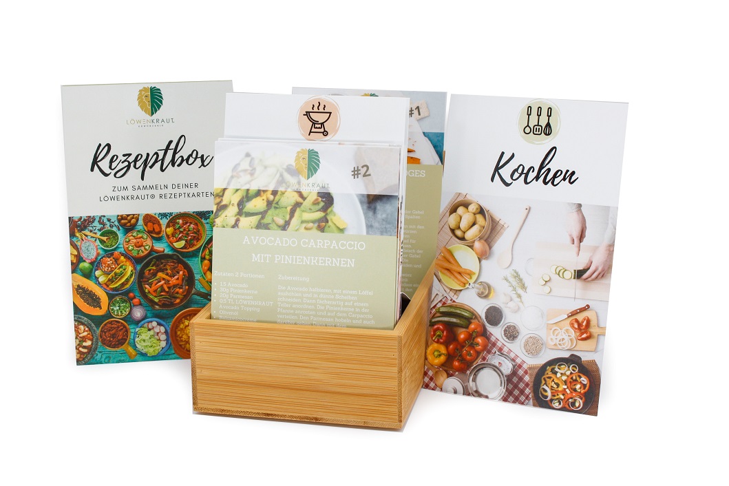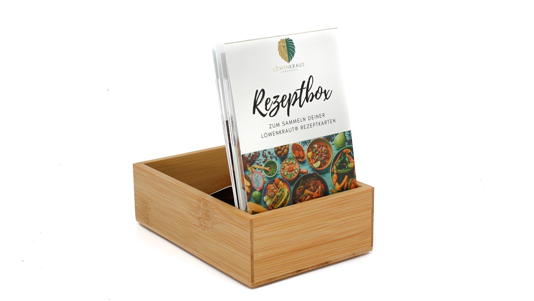Mit unserer hochwertigen LÖWENKRAUT Rezeptbox aus Bambus erwarten dich zudem 15 Rezeptkarten in handlicher Größe (12,2 x 8,7 cm). Mit dabei sind neben dem Deckblatt zusätzlich noch drei Registerkarten zum einfachen einsortieren deiner Sammelkarten.