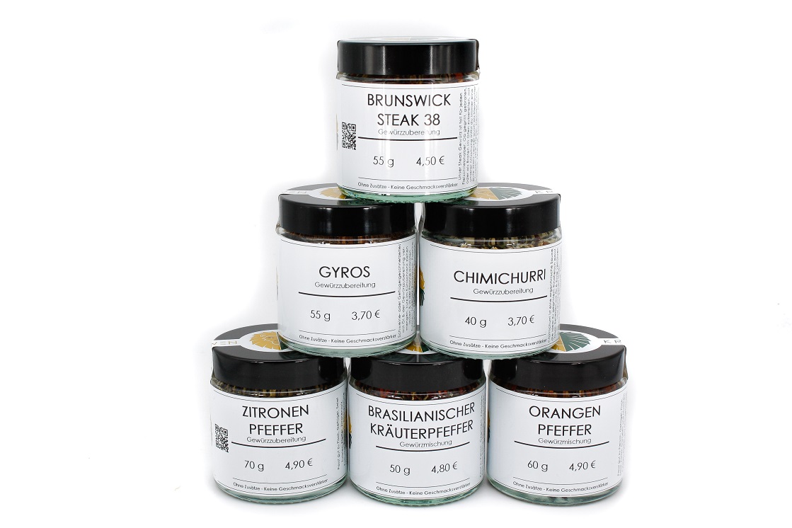 Brunswick Steak 38 Gewürz (55g), Orangen Pfeffer (60g), Zitronen Pfeffer (70g), Brasilianscher Kräuterpfeffer (50g), Gyros Gewürz (55g), Chimichurri Gewürz (40g)